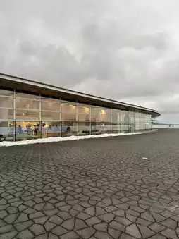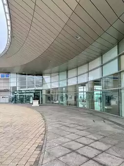 The building has a wavy curve and a beautiful lake spreads out before you.