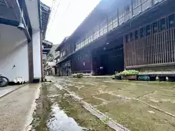 In front of the imposing torii gate, a stone pavement that turns pale blue when wet is laid out, creating a nostalgic street known as Blue Stone Paving Street. It just so happened that it was raining when we visited, allowing us to walk on the blue stone pavement.