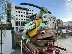 The stone frog has the inscription "Nawate Street, the town of frogs".