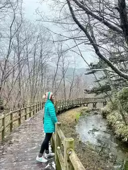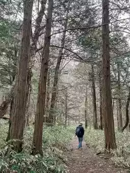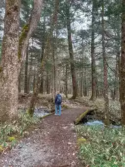 🌿After lunch, we continued on the trail to Myojin Pond, which is a full distance of 3.3 km. This route is different from the first one. It is a walkway on a bridge and a walkway in the forest, with a view of a small stream.