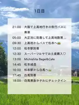 🗓️Itinerary Management: Day 1: Depart Osaka at 9:00 PM for Kamikochi