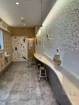 The themes are cute cat patterns 😺, the store's seating area wall pasted in money soup also common square mosaic collage tiles 👀.