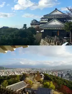 *️⃣ Matsuyama Castle is located on a steep hill in the center of Matsuyama City, Ehime Prefecture, and is one of the best places to overlook the Seto Inland Sea and Matsuyama City. Matsuyama Castle was built between 1602 and 1628. Matsuyama Castle, Himeji Castle (a Japanese national treasure and World Cultural Heritage Site), and Wakayama Castle are known as the three great flat mountain castles in Japan.