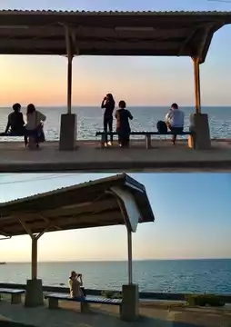 *️⃣ Shimonada Station is an unmanned station located in Iyo City, Ehime Prefecture. This small seaside station has been selected for the Seishun 18 poster three times. It is a great place to watch the sunset in the evening, attracting many railway fans and backpackers.