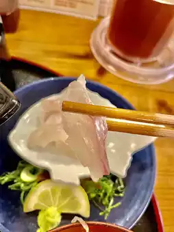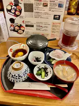 • Raw fish (red sea bream) sashimi mixed with egg and secret broth and sprinkled on top of warm rice
