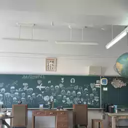 The classroom space has warm lighting and tables, and the hallway still has old textbooks, a blackboard, and gym equipment, making it feel like you’ve traveled back in time.