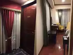 When we arrived at our room, we opened the door and saw some very old wooden furniture, including a bedside table, a suitcase rack, a dressing table, a single sofa, a round stool, a wardrobe, a TV cabinet, etc. There was also a double bed against the wall. The wallpaper and curtains were all old-style dark patterns!