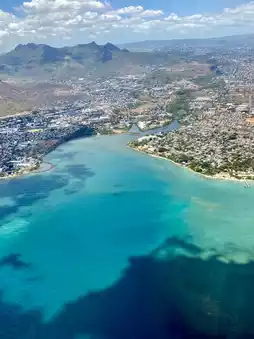 ✨ As you lift off, the scale of the island's beauty becomes clear. You'll soar over the lush, emerald-green peaks of the interior, spot the cascading ribbon of Chamarel Waterfall, and glide over the crystal-clear lagoons that shimmer in a thousand shades of blue and turquoise.
