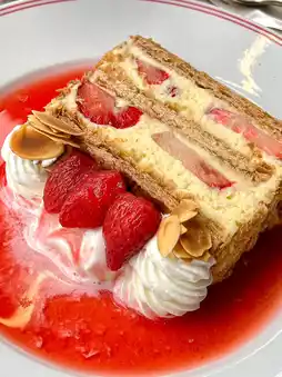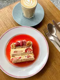I ordered their most popular treat, the strawberry Napoleon pie, which was absolutely delightful. The layers of flaky pastry combined with fresh strawberries and creamy filling made it a refreshing, indulgent choice. I also had a latte, which was fantastic – smooth, rich, and beautifully balanced.