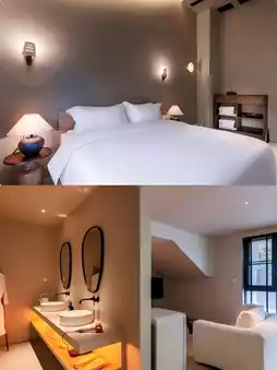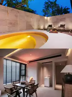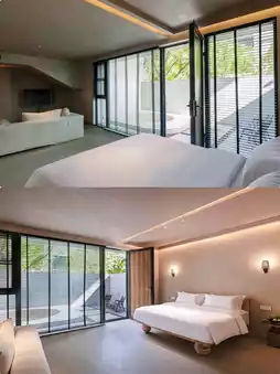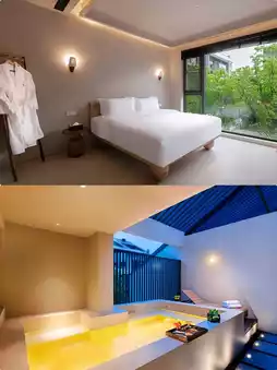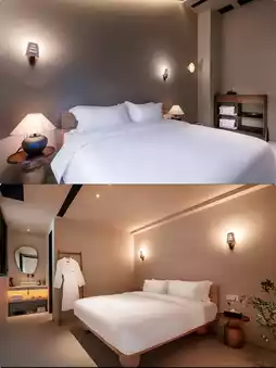 The hotel was designed by the Wood and Stone Structure Design Team, combining oriental minimalism with western aesthetic elements. The large area of micro-cement effect is very high-end, creating a unique and complete wabi-sabi style.