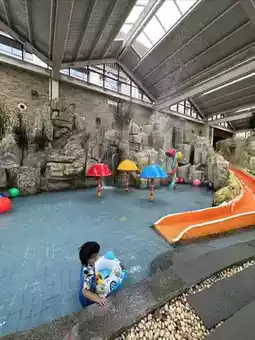 Firstly, stay for one night in a hot spring hotel room without a courtyard. The room has a living room, a small meeting room, and a bedroom. All rooms are in the villa and it's very quiet at night. There are many public area soup pools and wooden house private soup. The indoor includes a children's water play pool, which is not big but fun. The children's water park is under construction in the park and will be open to the public in the future. After soaking in the hot spring, it's nice to swim, feed fish, and boil tea around the stove. The food and snacks in the soup pool area are very cheap.