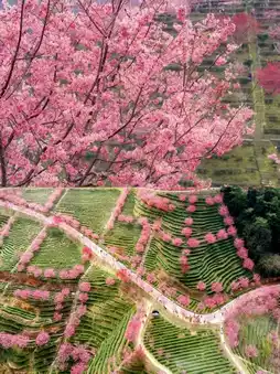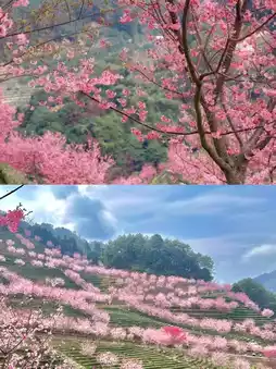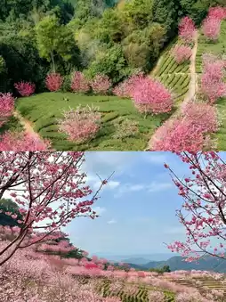 I have to say, the people of Guangdong are so good at hiding things! They've actually kept this dreamy cherry blossom tea field a secret. Among the vast expanse of verdant tea terraces, tens of thousands of delicate pink cherry blossoms bloom freely, stretching from one mountain to the next. It's a spectacular sight, like stepping into a breathtaking landscape painting.