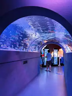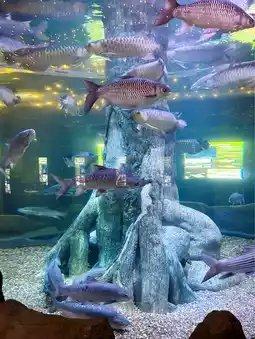 As we stepped inside, the first thing that caught our eyes was the massive cylindrical tank—the heart of the oceanarium. It stood tall, surrounded by a spiraling walkway that allowed us to observe marine life from every angle. The tank was teeming with colorful fish, and graceful rays gliding effortlessly through the water. We wandered through themed zones, each showcasing a different marine ecosystem.