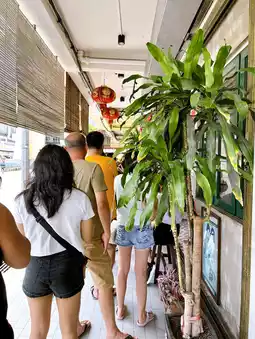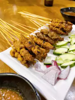The satay here is crazy good, especially with that killer peanut sauce mixed with pineapple—so refreshing and different. The meat is juicy and grilled just right. But beware, there's always a long line, and the place is tiny with hardly any seats. You might wanna grab some to-go and chow down back at the hotel. Just give 'em a ring beforehand to order and pick up later.