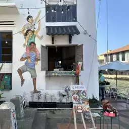 offering a range of local Malaysian dishes. It's located in the city of Melaka by the riverside. One of the special things about this restaurant is the way to order the traditional Malaysian dessert, peanut pancake, which we call apam balik. Customers can put money in a nyonya basket outside the restaurant, which is then pulled up with a rope. After that, the apam balik will be placed into the basket and lowered down to the customer."
