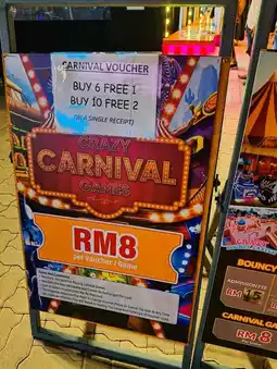 Individual rides are typically RM10 each, with bundle options available (e.g., Buy 10 Free 2). Bouncy castle admission is RM15, and carnival games are RM8 per voucher game.
