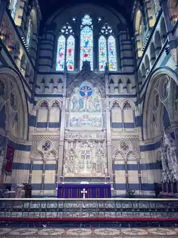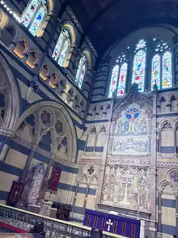 • Features: The striking contrast of sandstone and bluestone, spire, colored mosaic floor, and stained glass windows.
