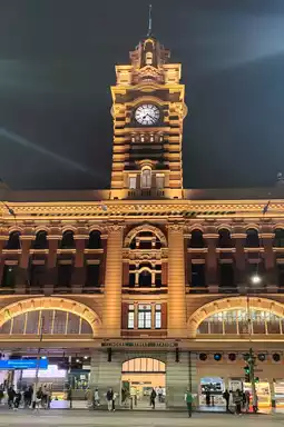 An iconic structure in the heart of Melbourne, this is the busiest train station in Victoria, accommodating the entire metropolitan rail system, 15 tram routes to and from the city, and V/Line services to Gippsland. Opened in 1854 by the Melbourne and Hobson's Bay Railway Company, the station—though not the current building—is the oldest in Australia. Starting from 2025, the Flinders Street station complex will expand with the opening of the nearby Town Hall rapid transit station beneath Swanston Street, offering several new entrances in the area.