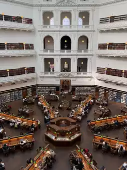 The star attraction is the La Trobe Reading Room, a magnificent octagonal hall crowned by a white dome that floods the space with natural light. Rows of timber desks, vintage lamps, and towering bookshelves give it an old-world charm that feels both peaceful and awe-inspiring. It’s a favourite spot for students, photographers, and anyone who loves quiet grandeur. 💡📷