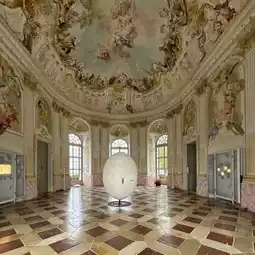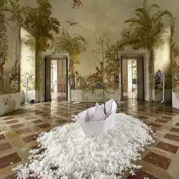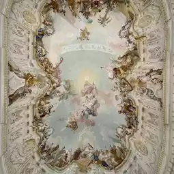 Stand on the **optical illusion floor** where black-and-white tiles create floating effects beneath Parnassus frescoes.