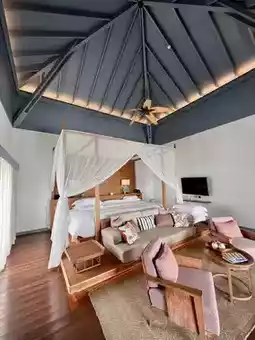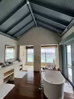 The overwater house in Raffles Maldives is over 2,000 square feet. Each overwater house is equipped with a large private pool and ladders that lead directly to the sea water, so you can easily enjoy snorkeling at any time.