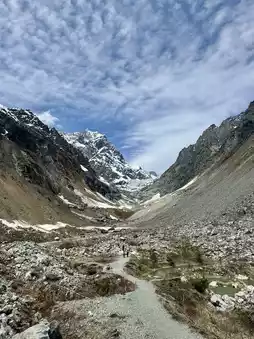 is a peaceful village nestled between white snow-capped mountains and medieval towers.