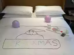 At the end of the bed, there is a merry Christams made of colorful yarn segments, as well as a handwritten card and cute gingerbread man cookies.