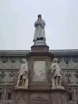 In the center of the square stands a statue of Leonardo da Vinci, crafted with remarkable detail, including his facial expressions.