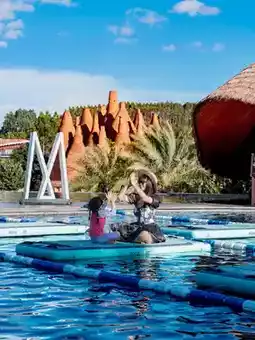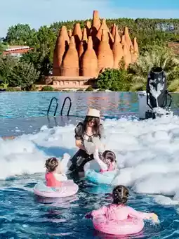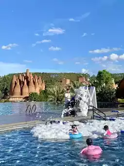 The outdoor super large infinity pool's shallow area is just right for the little cutie to play in the water, and Youyouzi couldn't wait to change into a swimsuit and head straight for the pool ✌🏻