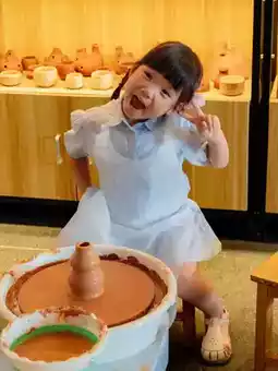 After seeing the art of bricks, why not make our own pottery jar? Youyouzi said she wanted to make a small gourd-shaped vase, so we started our first pottery wheel experience, and her focused look was too cute~