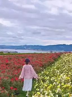 ▪️ Red and white rose sea 🌸 + purple foxtail grass sea + reed clusters make the perfect background, aerial shots of lake and mountain scenery are amazing