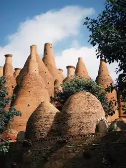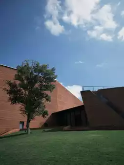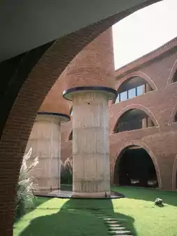 An irregular red brick building complex, the light and shadows at 4 PM are stunning! Side stairs + low-angle shots work best
