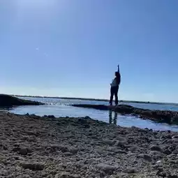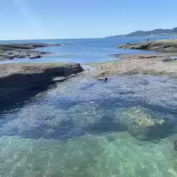 The water is clear and you can see all kinds of fish swimming around that have been left behind on the rocks.