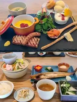 For breakfast, you can choose between Japanese and Western food, and both are very filling.
