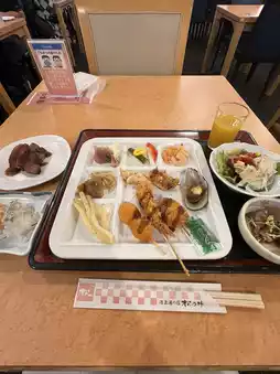 The dinner buffet included sushi, steak, and tempura, which was very satisfying!