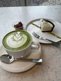 Matcha latte with sweets 750 yen Fukuoka Hoshino Tea Garden Yamabuki Okuyame matcha's distinctive umami and richness go perfectly with the mellow milk.