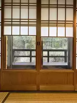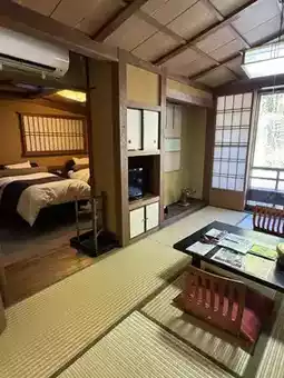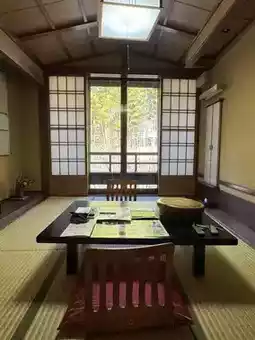 A large Japanese-Western style room with a view of the bamboo forest and the river from the window