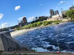 A historic and famous St. Anthony Fall. It was just around 5 pm, the sunlit waterfall, shining, and the water clear blue, like the color of the sea, far away can hear the sound of water flow