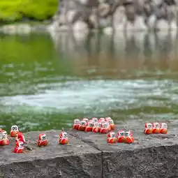 The atmosphere is very good. The trees are lush and green. The temple is cute. There are many red Daruma dolls placed at various points on the trees.