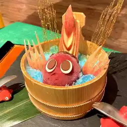 The sweets are crushed jelly made with local sake, topped with goldfish-shaped blackcurrant and apple-flavored jellies, making it a true Japanese sake jelly for adults 🍧