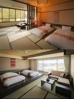 The guest rooms are filled with thoughtful touches: apple-shaped wagashi (traditional sweets) on the kotatsu table🍡, yukata in cherry blossom pink or pine green🌸🌲, and even a goodnight sweet soup flavored with Aomori's special honey🍯. The highlight is the window-side seating area, where you can sip hot tea and watch the firefly lanterns flicker in the courtyard💫.