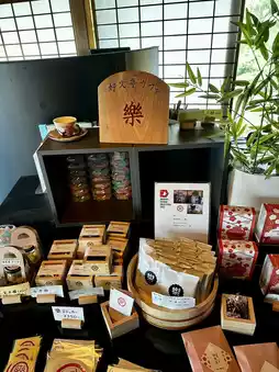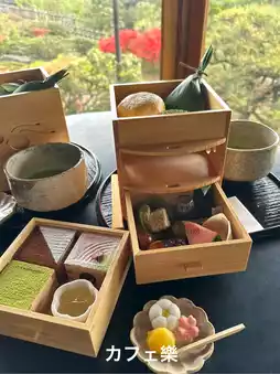 A cafe in the Nishinuri-en Hall of Kobuntei. You can relax with a cup of tea while looking out at Lake Senba and seasonal flowers.