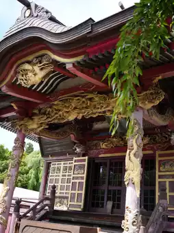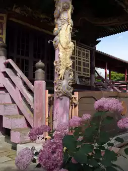 As you pass through the large vermilion mountain gate, you will see the main hall with a flashy design of a gold dragon carving on a red background right in front of you.