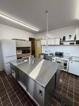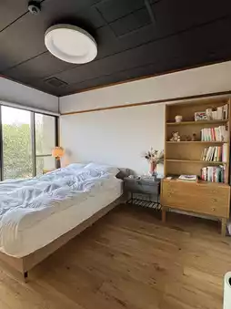 ・The 85m2 suite room on the second floor is equipped with a wood stove, a spacious living space, and a kitchen space.