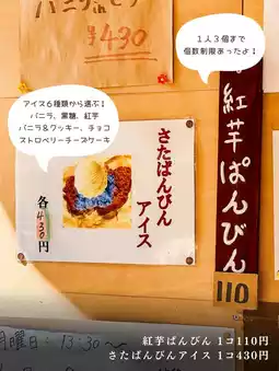 [💰 Price] Beni-imo Panbin 110 yen per piece Sata Panbin Ice Cream 430 yen per piece → Choose from vanilla, brown sugar, Beni-imo, vanilla & cookie, chocolate, and strawberry cheesecake