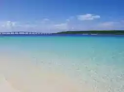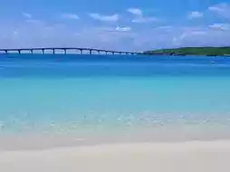 A rich ocean with a gradation of color spreads beyond the smooth white sand beach. You can see Kurima Island across the street, and the Kurima Bridge on the left side of the beach.