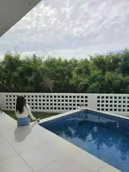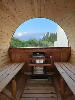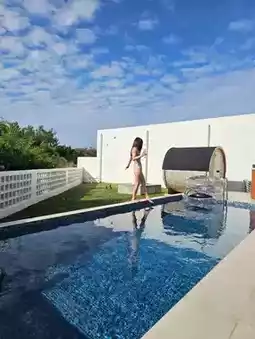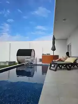 Spacious bathroom. Outside, there is a pool, sauna, and jacuzzi.