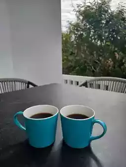 The kitchen is well-equipped with dishes, a Balmuda kettle, toaster, and even a waffle maker.
