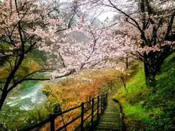 On a drizzling April day when cherry blossoms were in full bloom, I visited Oboke in the Shikoku Mountains, a very quiet train station with few people. I crossed the railway and strolled along the Oboke Valley stream. Although it was drizzling, walking on the trail with an umbrella among the blooming cherry blossoms was also a romantic experience.