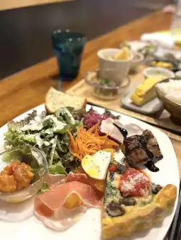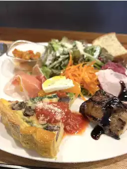 Salad, quiche, chicken, ham, and more, all on one plate.